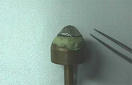 The rough diamond is shown mounted in a sawing pot with the smaller included piece exposed. Notice the black ink line that will direct the sawyer during the sawing operation. This type of off-centered sawing is called topping.