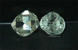 The saw plane on each piece of rough will automatically become the table facet for two round brilliant cuts. We can now observe the larger piece on the left fully roughed out and the smaller piece partially roughed out. Roughing out is the process in which preliminary facets are placed on the rough to check the best position for final placement and orientation of the finished diamond.