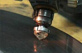 The smaller (7.56ct.) piece of rough is being bruted to obtain a circular outline. Notice an industrial diamond embedded at the end of a rod is applied to the rough as it rotates. Great care is taken so that the large inclusions in this piece does not expand or travel deeper into the rough.